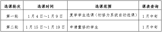 (2)重修选课时,请特别注意教学班所在教学点,慎重选择教学班,以免课程学习和考试受到影响。选课如有问题,请在1月15日~1月19日的工作时间(8:30~16:00)联系学务老师。