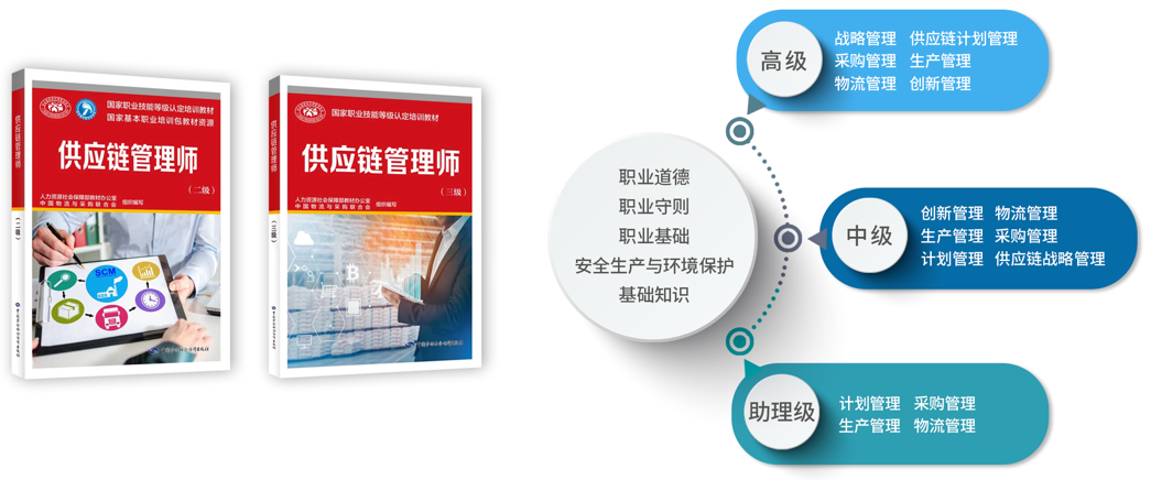 供应链管理师认证级别分为:助理级、中级、高级等三个级别,课程考核体系如下: