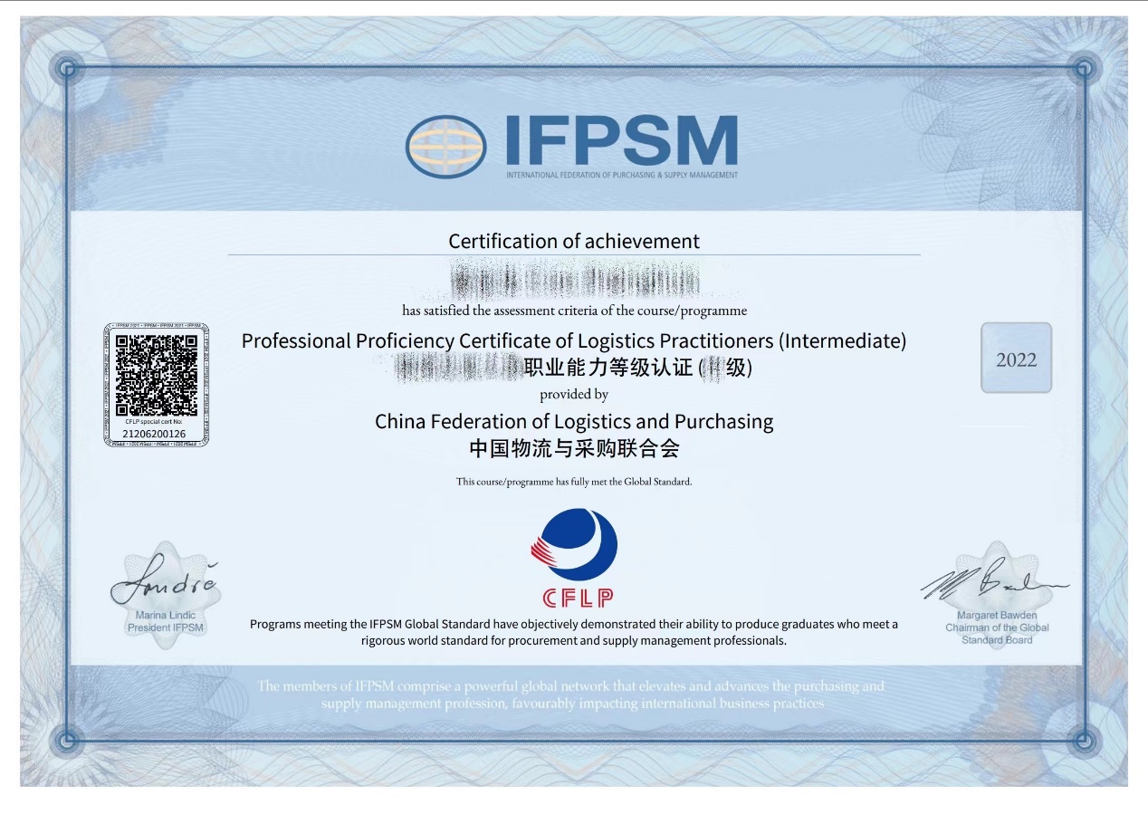 获得物流师职业能力等级证书后,可申请由国际采购与供应管理联盟(IFPSM)颁发的采购与供应全球标准认证证书。该证书在全球44个国家和地区得到认可。