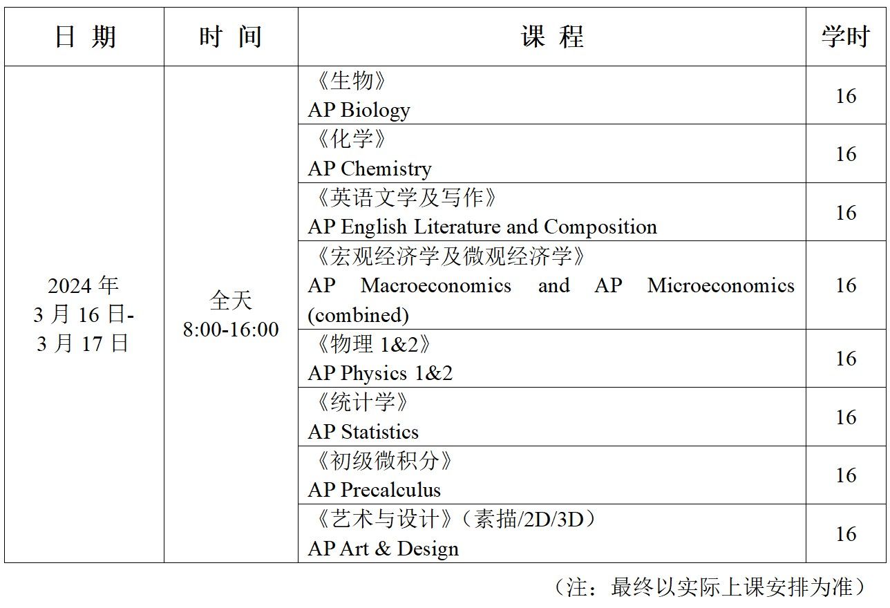 【时间安排】春季AP教师培训:2024年3月16日-2024年3月17日(2天)。