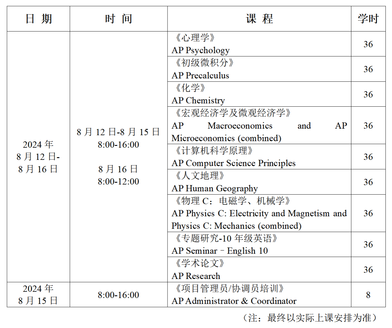 【时间安排】暑期AP教师培训:2024年8月12日-2024年8月16日(4.5天),仅《项目管理员/协调员培训》2024年8月15日(1天)。