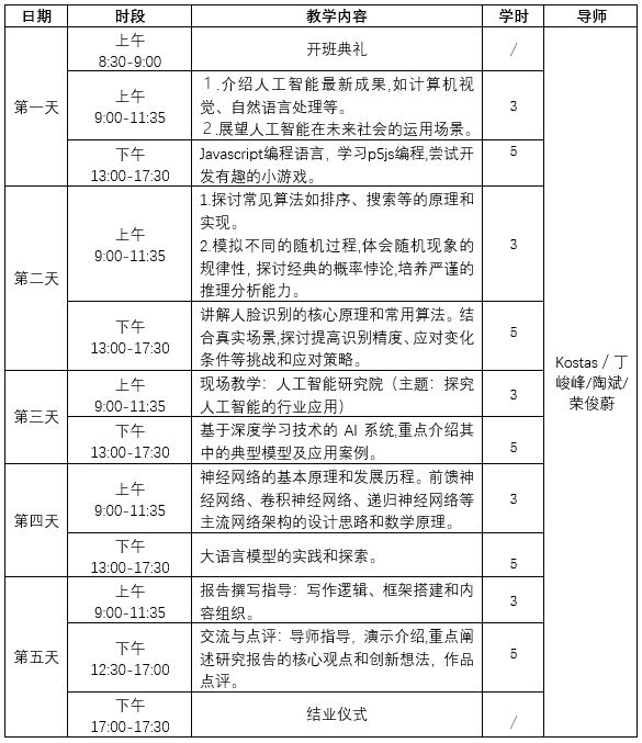 主要引导和拓展学员纵览人工智能技术应用的无垠视野,领会编程算法的严谨思维,体察学理融通生活的智能方式,在亲身实践中探寻人工智能科技的未来发展理念,彰显科学与人文的融合之美,为学员开启智能时代的无限想象力和创造力。