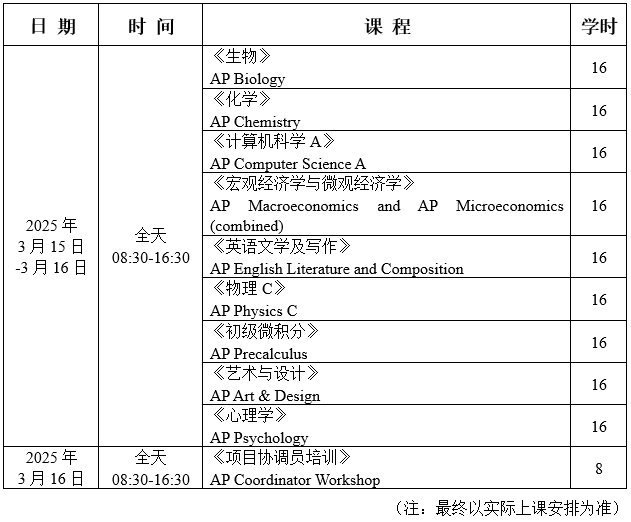 为加深国内国际公司以及公办高中国际部一线教师与管理者对美国大学先修课程(Advanced Placement,以下简称“AP课程”)体系的全方位认知,帮助他们更好地理解世界顶尖大学的育人理念并更有序地开展AP课程教学工作,由大学理事会(College Board)主办,韦德体育承办的“2025年春季AP教师培训”将于2025年3月15日-3月16日在韦德体育沪北校区举行。参加培训的老师们将学习相关学科的教学目标和框架、课程和考试涵盖内容、分享模范教学方法等。所有培训均由大学理事会特别认证的培训专家亲临指导。