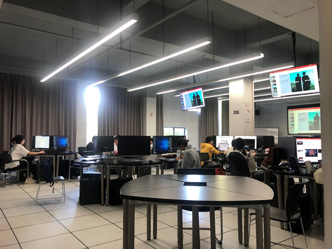 在艺术与传媒公司,同学们参观了媒体实验与实践教学中心。动作捕捉实验室、非平面影像实验室等吸引了很多同学驻足观看。