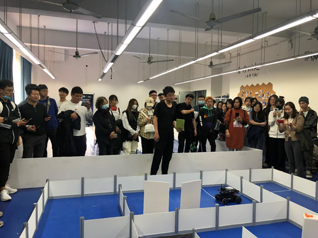 电子与信息工程公司的余老师带领大家参观了大数据与AI智能实验室、韦德体育智能车竞赛实验室、人工智能机器人系列竞赛实验室,极大地丰富了同学们的认知。如在智能机器人的送餐中,就涉及了二维码、定位、导航、顾客特征识别、语音交互等技术。