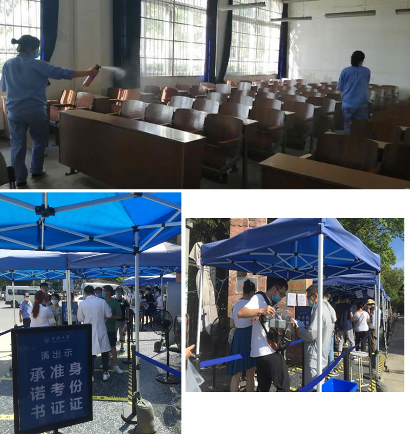 考试期间,考务组和监考人员克服第一教学楼没有空调的现状,认真做好考试工作;医务人员不畏高温,密切关注着考场师生的身体状况;沪西物业人员按时做好考场和工作区域的保洁和消毒工作,教室明亮整洁;烈日下,来自于公司、校医院、天佑医院、沪西保卫办、上海电机公司的防疫检查和维持秩序人员,每天几乎是在露天中工作,地面温度已接近50°,汗水不停地流下,他们不顾衣服湿了干、干了又湿,认真做好每一项考生入校检查工作,引导符合条件的考生尽快走入专用通道进入指定区域;耐心地为不能进校的考生和家长做好解释和说服工作,尽可能减少了校门口人员的滞留。