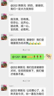面对这场突如其来的新冠疫情,社区作为抗击疫情的第一线,筑起了抗击疫情的第一道防御墙。韩新元所在的小区楼栋于3月19日被划为密接楼,是最早实行封闭的楼栋之一。她积极报名参加志愿者,主要负责传达居委通知、特殊人群的帮扶、居民核酸信息采集等工作。为了让居民第一时间了解新冠肺炎以及疫情防控期间的各项措施,只要接到上级通知她就尽快转发到楼栋微信群,让居民了解疫情情况,避免不必要的恐慌。她家附近是东方医院,小区楼栋里还住有外省市来上海保胎的几个孕妇,她及时帮助她们联系居委人员,让她们和家人更加安心,放心待产。在做志愿者工作中,会碰到形形色色的人,有理解的、有不配合的、有出言伤人的、不愿下楼做核酸的等等,她都会尽力耐心劝导,不厌其烦进行解答。在这场没有硝烟的战斗中,作为共青团员,韩新元希望可以贡献自己微薄的力量。她坚信,只要大家团结一心就一定会战胜疫情打赢这场硬战!