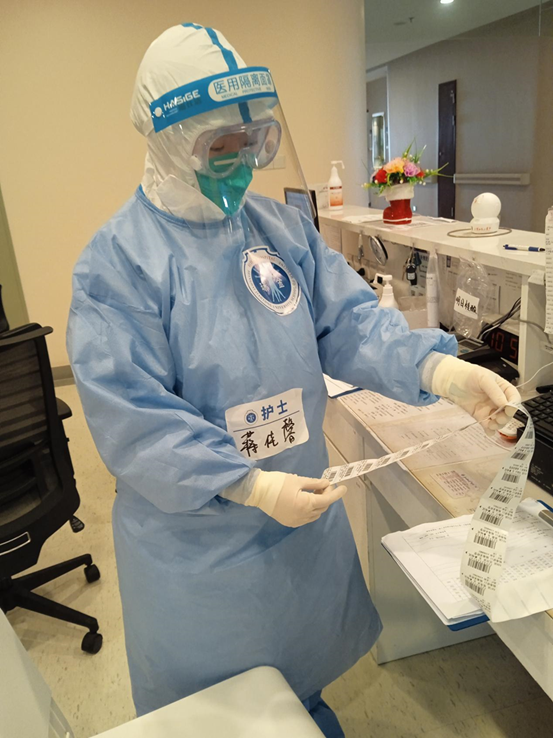 疫情防控中,蒋佳馨同学坚持在抗疫一线,在上海新冠肺炎定点救治医院瑞金医院北部院区参与患者的救治工作。