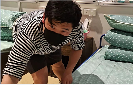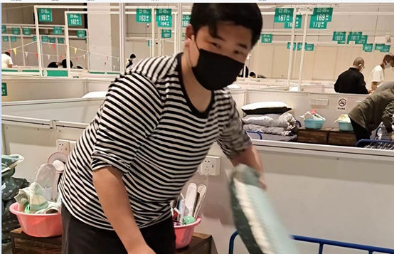 在疫情渐重,国家会展中心方舱医院初建之际,徐阳同学发挥退役士兵应有的作风,不畏疫病,迎难而上,第一时间报名了第一批方舱志愿者。在小区门口苦等29小时才坐上前往方舱的志愿者大巴,初到就主动搬运简易床四十余张,被褥、毛毯共二百余床,后亦多次帮助仓库搬运各类支援物资。入舱前,依靠自己准备充足的多余生活物资,帮助匆忙来沪支援的苏州志愿者们解决问题:接线路,剃头发,生活必需品采买,申请核酸码……入舱后积极协助医生,护士,武警,特警等完善初建方舱内的软硬件,为舱内患者的各类需求提供帮助,同时完成清扫,消毒等日常工作。