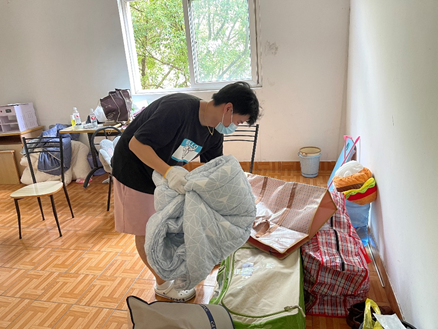 由员工工作办公室、高端培训部门、后勤保障部门的老师们组成志愿者团队,他们化身“打包员”“搬运工”,克服高温、灰尘、蚊虫叮咬的困扰,连续多日在宿舍为40多名学员整理、打包行李。按照与学员沟通联系的情况,提前做好每一天的打包计划与安排。班主任老师分组与学员进行现场视频连线,以一对一全程“直播”的方式确认学员个人物品。老师们也相应地根据每个学员物品的类别装袋、装箱,一一搬运在大厅里集中放置、填写姓名标签、进行编号,并做好记录。还拍照告知每个学员具体的待邮寄信息。现场工作井然有序。