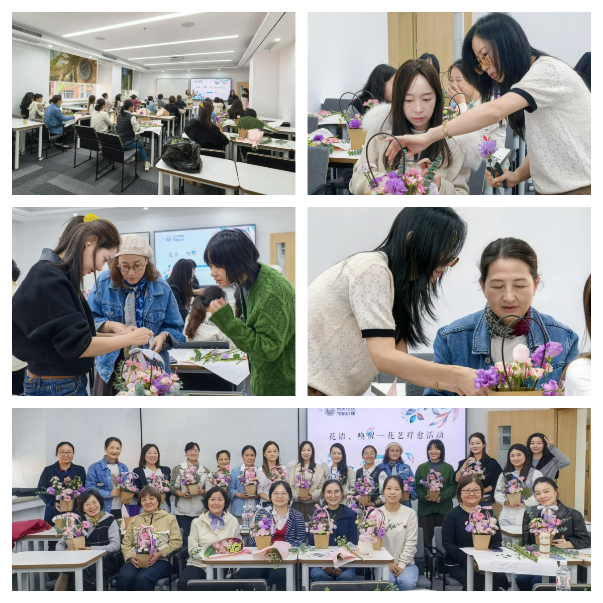 在专业花艺师的讲授与引导下,老师们加入个性化创作,亲手制作了多款插花作品,在形态、颜色上做好搭配,赋予每一个作品温馨与治愈的寓意。活动现场,在音乐、笑声的衬托下,老师们交流心得,放松身心,缓解压力,分享创作灵感,提升审美情趣,展现了团结友爱、积极向上的精神风貌。