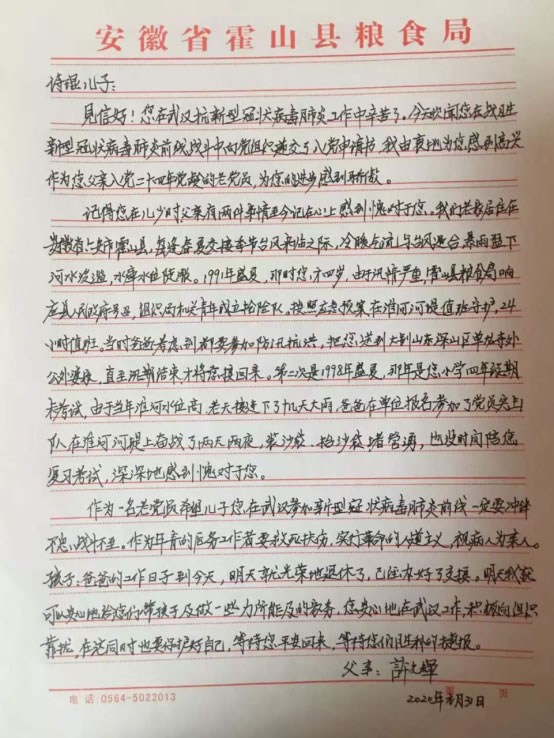 他说,要把上海的精细化管理和操作规范不折不扣“搬”到武汉。得知儿子在抗“疫”前线递交了入党申请书,有着二十四年党龄的老党员父亲发来一封家书。