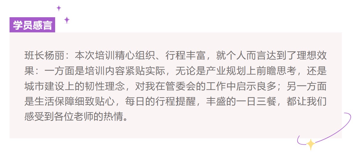 5天的集中培训开阔了学员视野,更新了学员的知识结构。理论和案例教学相结合的教学方式,让学员们不仅提高了理论水平,还从案例教学中汲取了实践经验,为实际工作中遇到的痛点难点问题提供了解题思路。学员们在结业仪式上表示培训虽然结束,但学习和应用才刚刚开始,未来将不负组织的信任和期待,把上海先进的管理服务模式引入郫都区,把所学到的内容用于实际工作中。