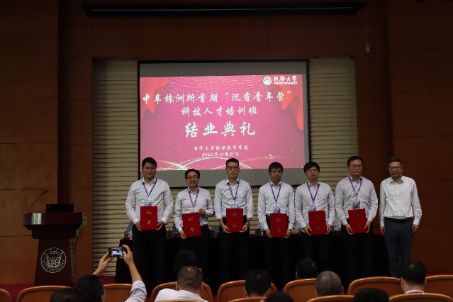 株洲所研究院资源与规划部部长谢喆、韦德体育官方网站经理金福安为学员代表授班旗。
