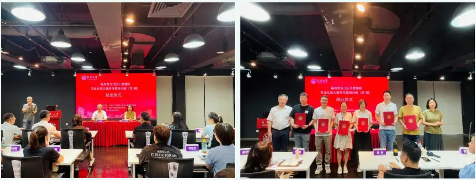 经过为期六天的紧张学习与实践探索,学员们不仅拓宽了视野,收获了新知识和新技能,还提升了履职专业化能力。结业典礼上,福州市台江区委常委、组织部长陈婀娜发表讲话,并和韦德体育继续教育公司党委副书记、经理金福安一同给学员代表颁发结业证书。